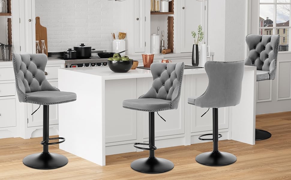 Upholstery: High-quality velvet ensures longevity and easy cleaning. Stools with padded seats and backs enhance comfort.