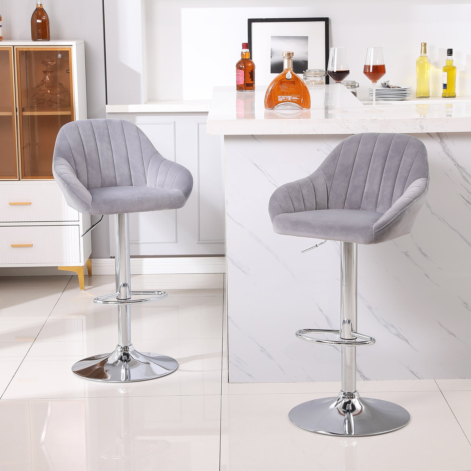 The soft velvet bar stool features a chic velvet finish that adds a touch of elegance and sophistication to any room. The extra-large chrome base provides stability, making it a great addition to any bar, kitchen, or dining area.